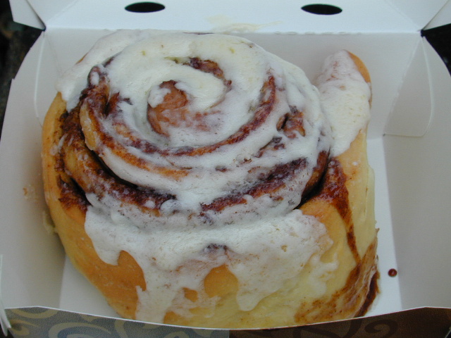 コレがそのシナモンロールだぁ!!(ドゴーン!!)ちゃんと紙の箱に入っていてまるでハンバーガーみたいです。ボリュームもあり1個でお腹いっぱいになりますよ。ちなみに左が「シナボン」右が「ピーカンボン」です。 |  |