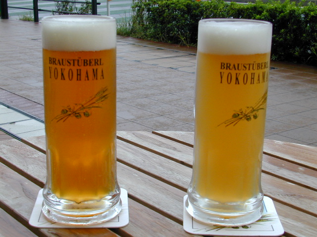 新港地区ワールドポーターズ1階にあるビアレストラン「ブラウステューベル横浜」のバナナビール!!(右手側)店内の釜で作られているハマの地ビールです。これは小ジョッキで360円です。営業時間は午前10時〜午後11時まで。ちなみに左のビールはディンケルで麦をローストしたビールです。コクがあるのが特長です。 |
