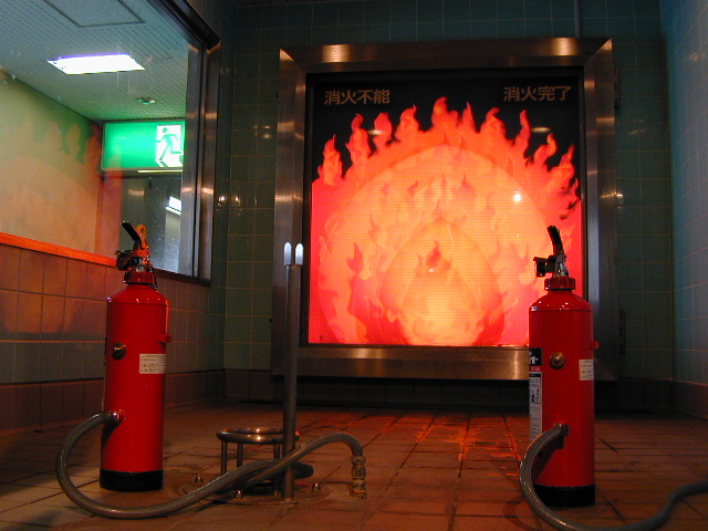 「横浜市民防災センター」は市民の防災教育の施設なんです。もちろん災害時には救援活動の拠点にもなる場所なんですよ。さて、こちらは消火器の取り扱い訓練コーナーです。火に見立てたパネルに向かって消化訓練をするんです。本来、消火器の中身は粉末ですが、こちらでは水を使っての訓練になっています。火の元、下を掃くように水(粉末)をかけるのがポイントとのことです。 |