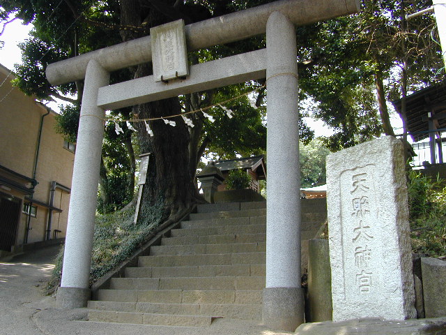 笹下の街の総鎮守「天照大神宮」です。石の鳥居の隣にあるのは市指定の名木古木「シイ」の木です。ここは高台にあり、木陰に入れば涼しい風が吹きますよ〜。 |