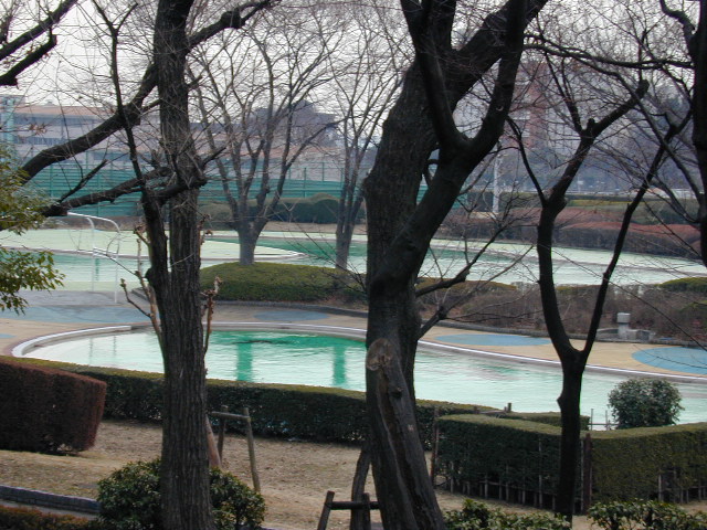 なんか盗撮っぽいですが夏場はたくさんの人で賑わう「鷺沼プール」です。今は水はありますが、とーぜん人はいません・・・。鷺も・・・・いません(T_T)。 |