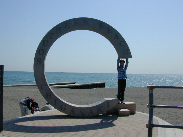 茅ヶ崎サザンビーチに新しくできたモニュメント「茅ヶ崎サザンC」です。ちょーど私のいる所ここに人が立つと「C」ではなく「○円」になりますよね〜。実は「縁(円)結びの輪」「思いやりの輪」という意味が込められているんです。○の先には茅ヶ崎の海、そして烏帽子(エボシ)岩が見えるんですよ!!新しい記念撮影スポットですね! |