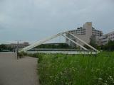 | 駅を後にして公園に来ました!新横浜駅前公園ですね〜!!川沿いにある公園で、写真の三角の橋を渡れば日産スタジアムになります! |